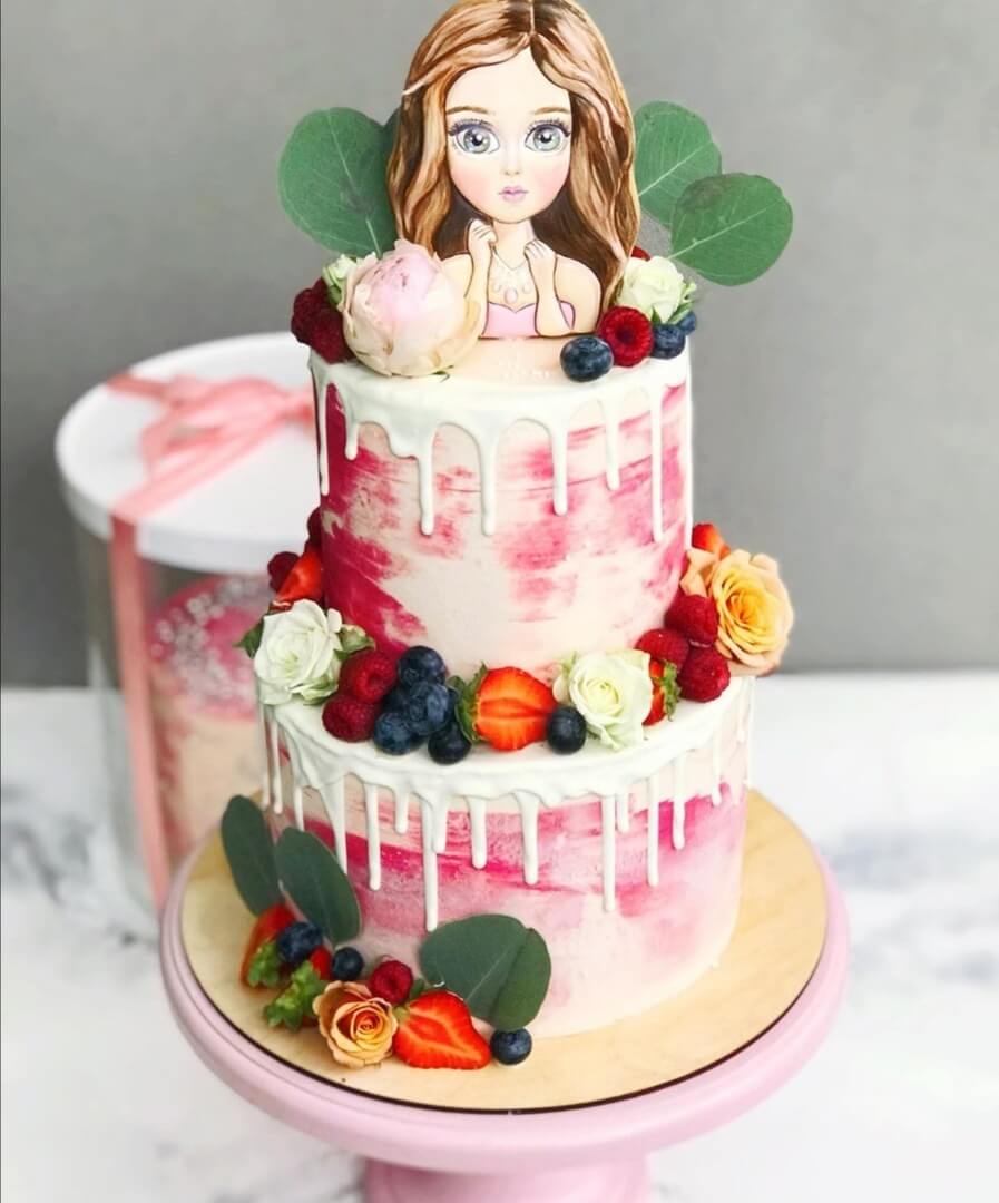 Милейший двухъярусный тортик может быть украшен изображением именинницы - сладко и вдвойне приятно!